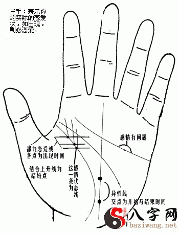爱情线:自小指旁边(pangbian)开始为男(二十岁(ershisui)),女(18岁),小拇指正中间的爱情线为xianwei女(23)男(25),别的类推。