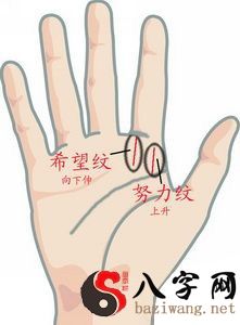 核心(hexin)要点(yaodian)上往上走的纹(下面(xiamian)的图中深蓝色(shenlanse)斜线所显示),表明勤奋会出现成效;若在核心hexin要点(yaodian)起始点往无名指(wumingzhi)下升叫“期待qidai纹”。有qidai期待纹的人,梦越大运势越好。